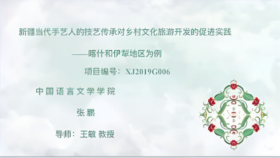 最后,18级博士研究生张鹏进行答辩的创新项目为《新疆当代手艺人的技艺传承对乡村文化旅游振兴的促进实践——以喀什和伊犁地区为例》,并从项目的基本情况、可行性方案、项目成果展示、成果研究等六方面的内容展开汇报。而后,专家老师对该项目进行了评价。成湘丽老师认为该课题将“产-学-研”相结合,创新性较强。但成果中的文学作品《小满》与前期的成果总结不相符,希望后期调整提交的材料。朱贺琴老师建议课题的研究成果要与申报书撰写的预期结果相符合。庞海音老师提出《小满》作为文学作品在一定程度上与项目成果的学术性不吻合,并提醒员工注意并综合梳理项目的学术性成果。